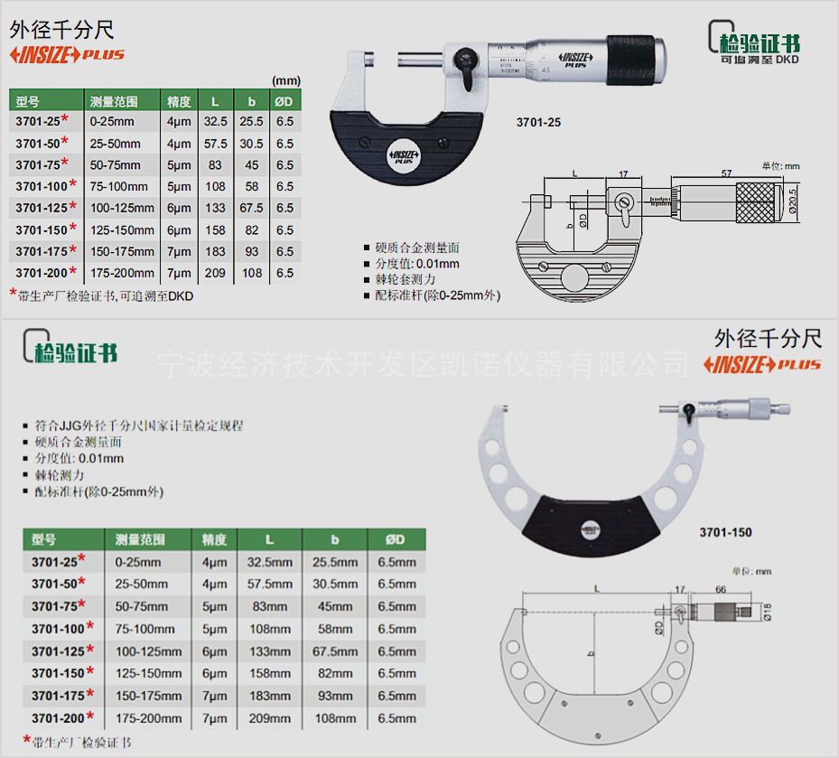 INSIZE英示正品原装外径千分尺3701系列技术参数:规格