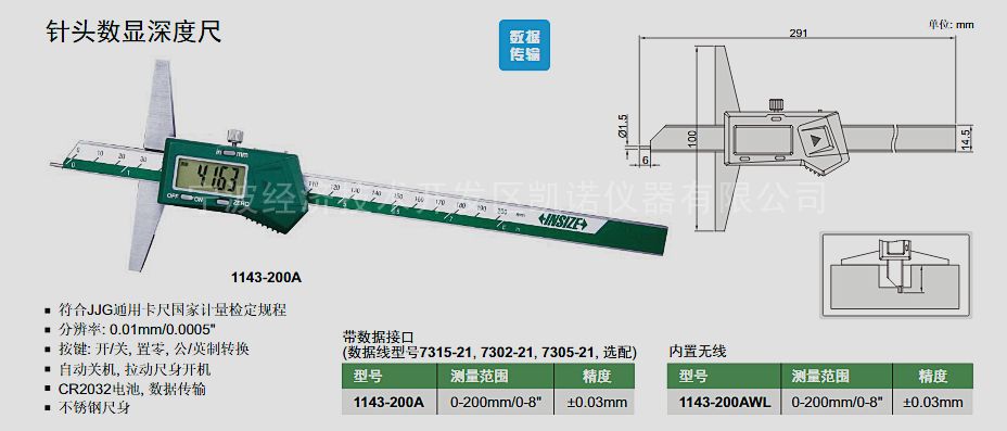 INSIZE英示正品原装针头数显深度尺1143-200A技术参数:产品